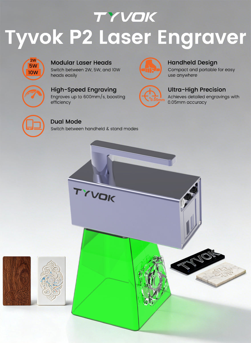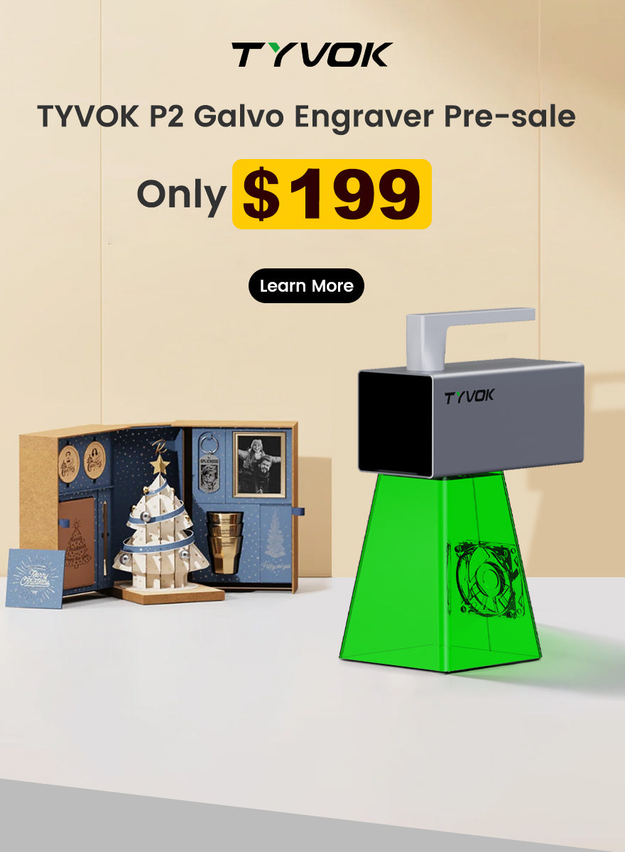Tyvok's P2 series laser engravers transform ideas into products, enhance classroom learning, create unique gifts, and fuel personal DIY projects. Perfect for turning concepts into high-quality items for sale, engaging students, crafting memorable presents, or enjoying creative fun, Tyvok's machines offer endless possibilities for innovation.