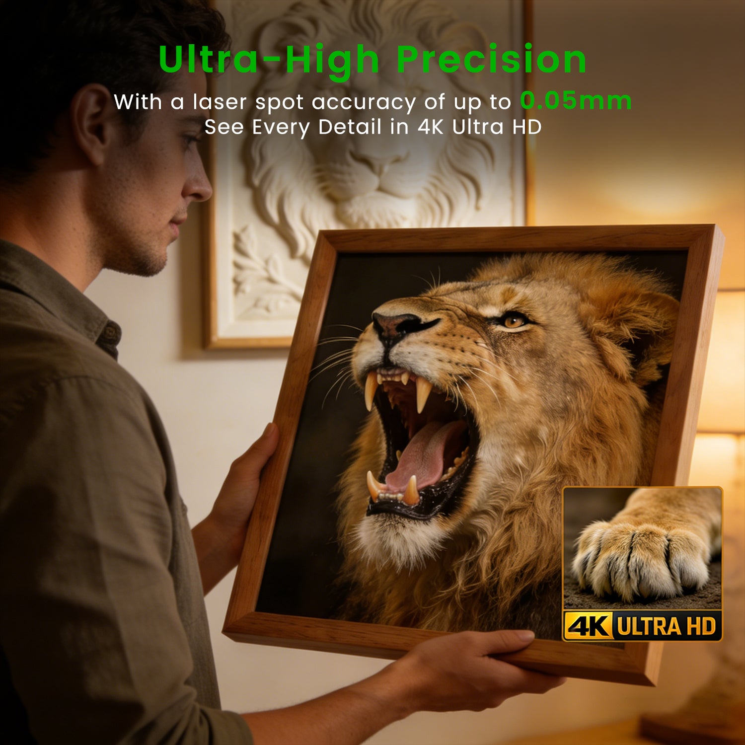 Dual-lens and dual-focus system, enhanced with compressed spot technology, concentrates laser power into a tiny 0.05mm spot size, delivering ultra-fine 2K resolution engraving results.